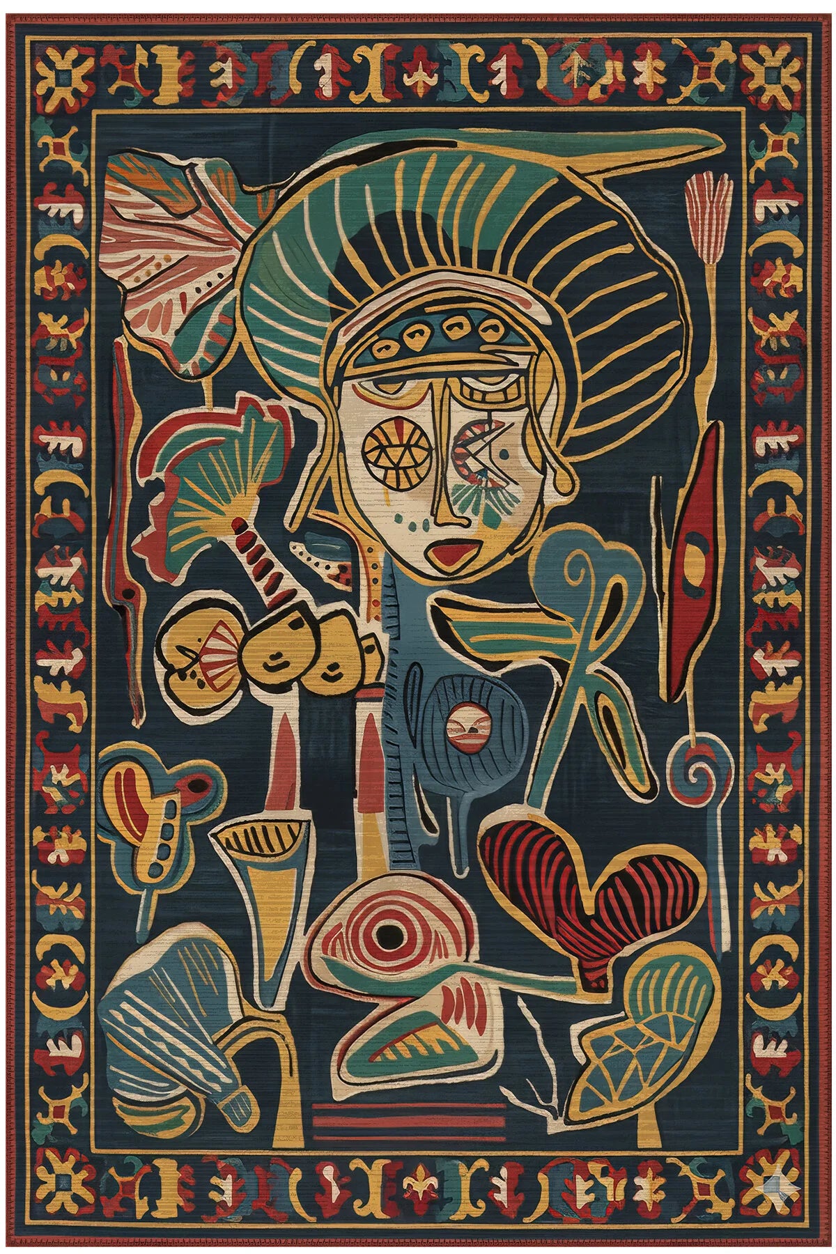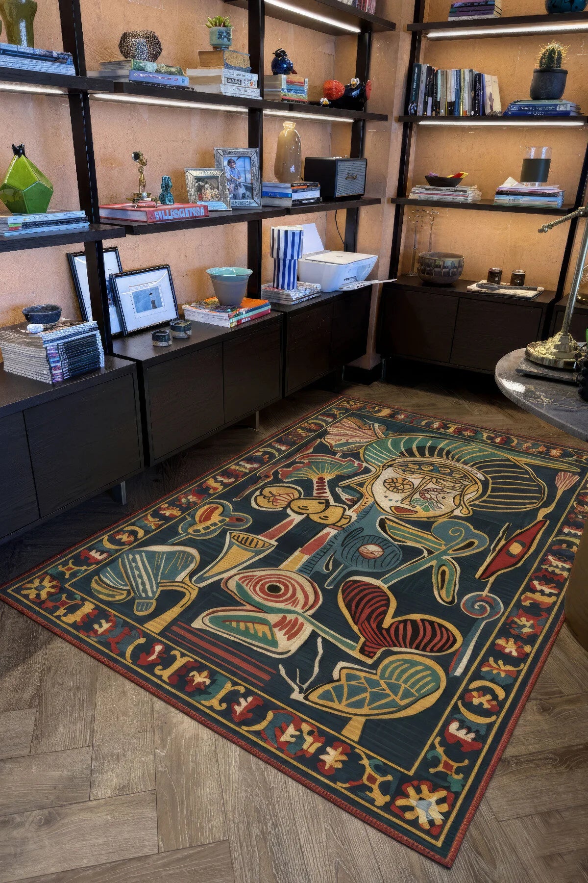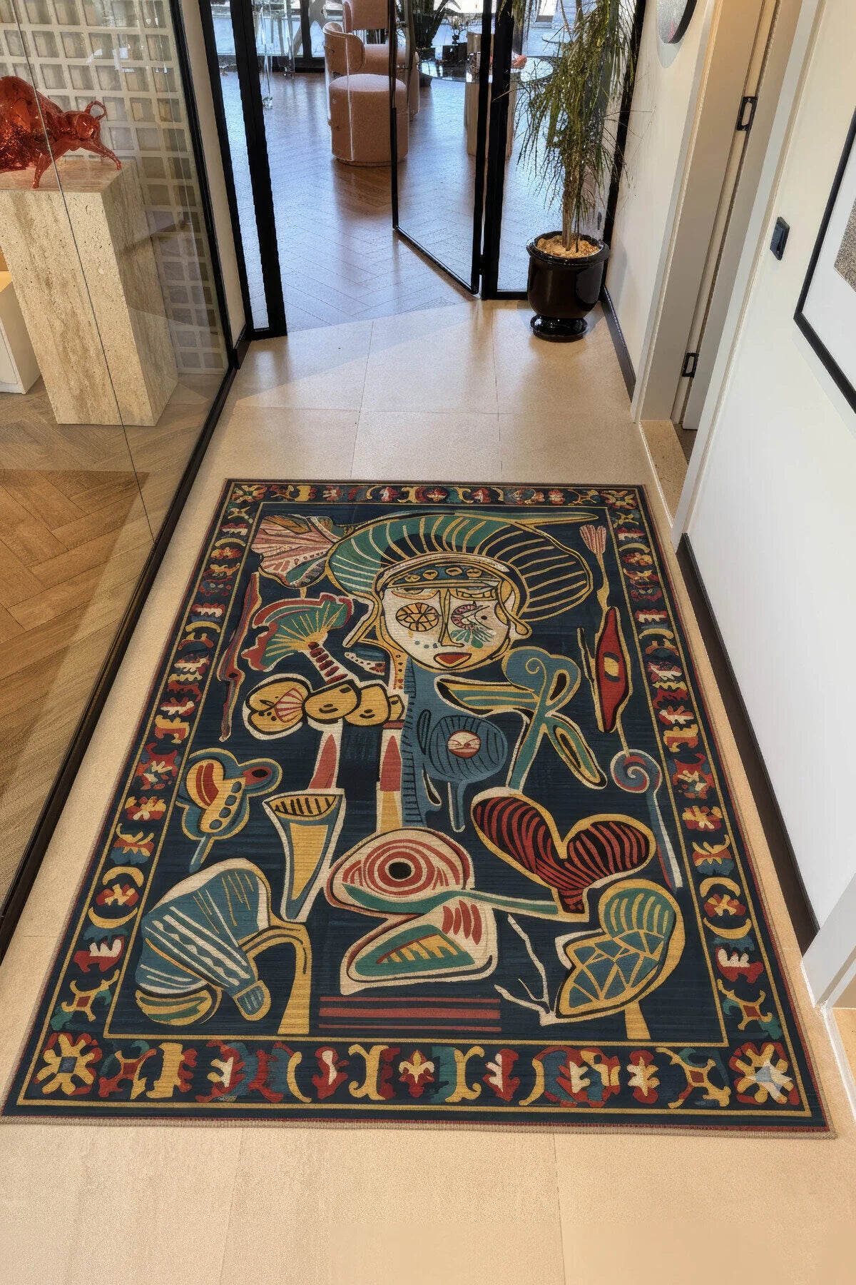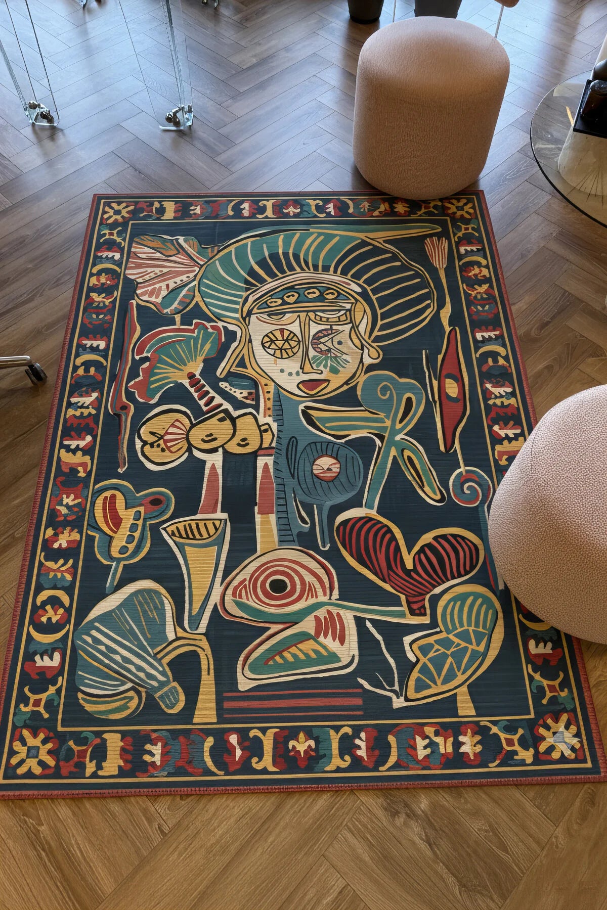 Allure halısı, modern sanatın özgün ruhunu ev dekorasyonuna taşıyan göz alıcı bir tasarımdır. Lacivert fon üzerinde yer alan turuncu, kırmızı, sarı ve yeşil tonlar; güçlü kontrastlarıyla yaşam alanlarına sanatsal bir enerji kazandırır. Abstrakt figürleri ve geometrik çizgileriyle tablo etkisi yaratan bu halı, farklı dekorasyon tarzlarıyla kolayca uyum sağlar. Cesur renk geçişleri ve modern formuyla, klasik halı anlayışına meydan okuyan avangard bir duruş sergiler.