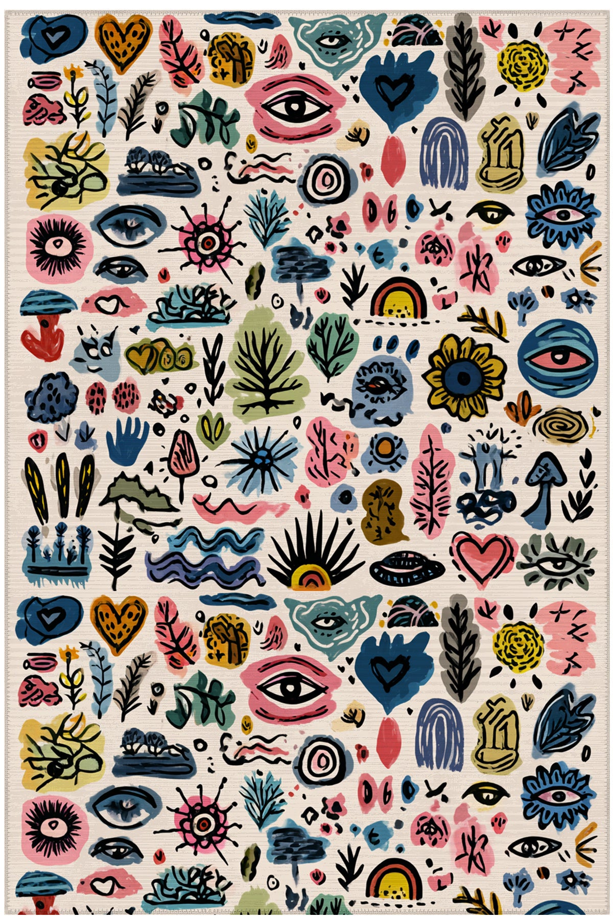 Auro 303 Renkli Bej Göz El Çizimi Tasarım Modern Yıkanabilir Halı Koridor Hol Oda Ev Halısı