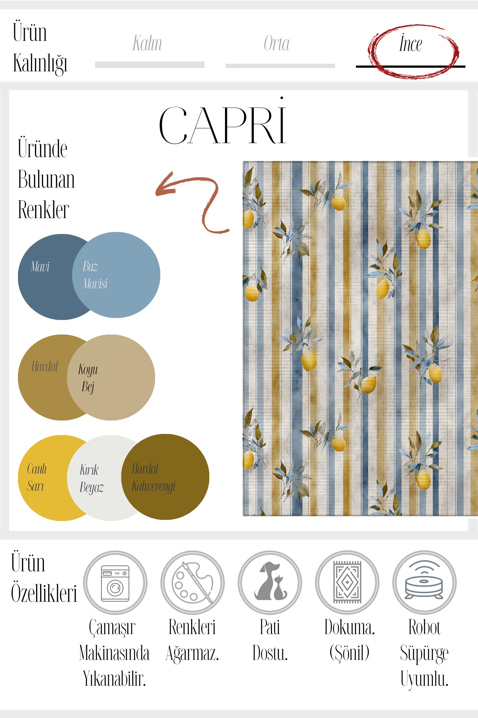 Capri 352 Mavi Bej Çizgili Halı | Limon Desenli, Modern ve Yıkanabilir İnce HalıAkdeniz’in taptaze esintisini evinize taşıyan Capri 352 Mavi Bej Çizgili Halı, şık çizgili deseniyle modern dekorasyona dinamizm katıyor.; Mavi ve bej tonlarının uyumunu limon motifleriyle buluşturan bu özel tasarım, ferah ve enerjik bir görünüm sunuyor.; Salon, oda, hol ya da yazlık evlerde dikkat çekici bir atmosfer yaratarak mekânınıza zarif bir hava katar.; İşlevsel yönleriyle de öne çıkan Capri 352, 1750 gr/m² gramajıyla dayanıklı ve uzun ömürlüdür.; 5 mm ince kalınlığı sayesinde zarif ve hafif bir kullanım sunar.; Makinede yıkanabilir özelliği ile günlük temizlik son derece pratiktir.; Dokuma taban üzerine şönil yüzeyle üretilen yapısı, hem yumuşaklık hem de sağlamlık sağlar.; %70 pamuk ve %30 polyester içeriği, doğal bir his ve uzun ömürlü kullanım imkânı sunar.; Ürün Detaylarıİçerik: %70 pamuk, %30 polyesterYüzey: ŞönilTaban: Dokuma tabanGramaj: 1750 gr/m²Kalınlık: 5 mmŞekil: DikdörtgenMenşei: TürkiyeÖzellikler: Makinede yıkanabilir, kolay temizlenebilir, toz tutmazÖne Çıkan ÖzelliklerMavi ve bej çizgili modern tasarımLimon motifleriyle ferah ve enerjik görünümİnce ve hafif yapısıyla pratik kullanımYumuşak şönil yüzeyiyle konforlu hisSalon, oda, hol ve yazlık ev dekorasyonları için ideal seçimUygun Arama Etiketleriçizgili halı, limon desenli halı, mavi bej halı, modern salon halısı, Akdeniz tarzı halı, yıkanabilir ince halı, şönil yüzeyli halı, dokuma tabanlı halı