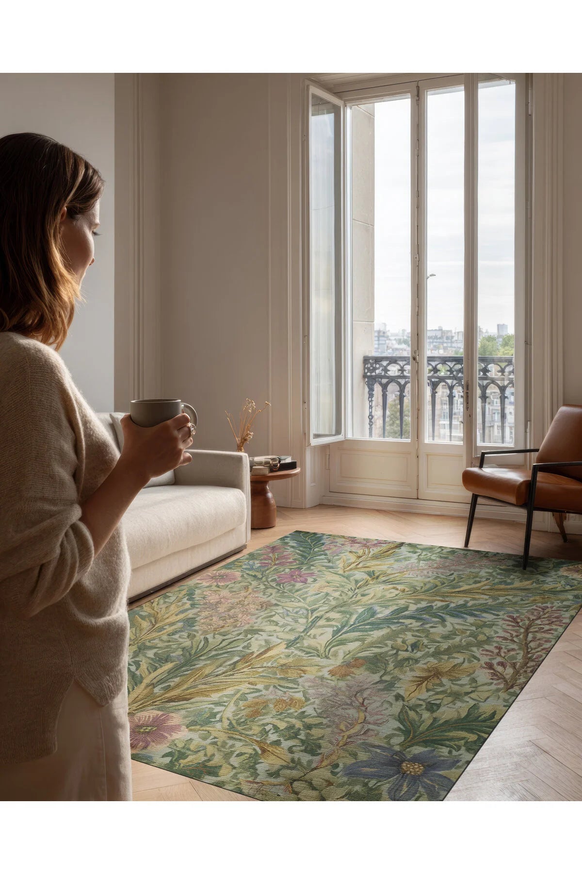 Garden 807 – Yeşil Çiçekli Vintage Halı | Doğal, Klasik, İnce Dokulu, Yıkanabilir Zarif Tasarım