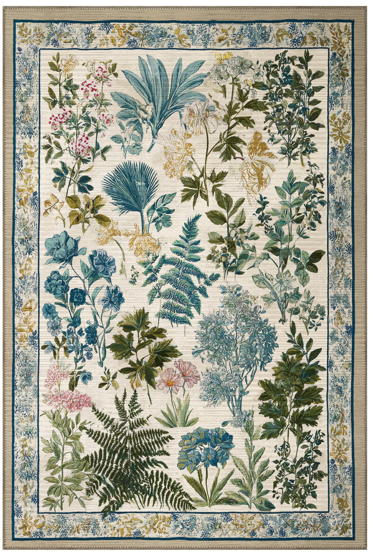 Yeşil Bej Botanik Çiçekli Halı – Yıkanabilir İnce Dokuma Tabanlı Salon ve Oturma Odası Halısı