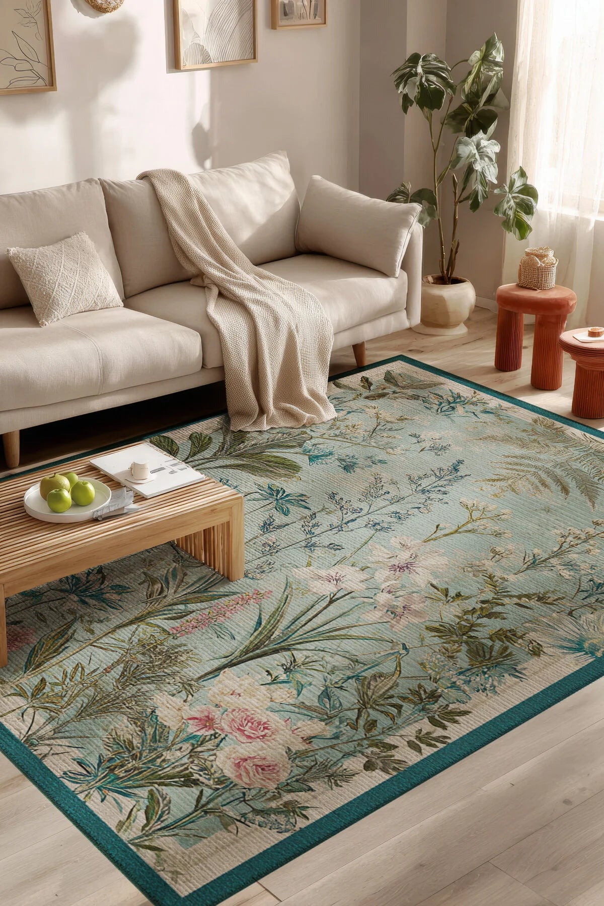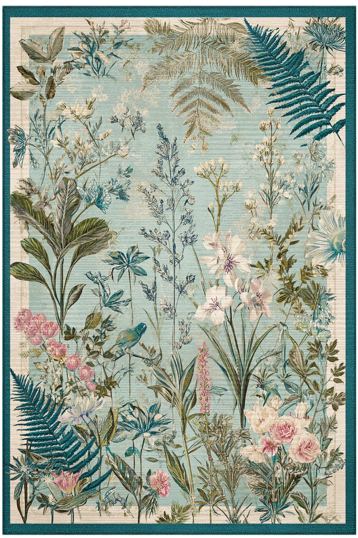 Mavi Yeşil Bej Botanik Çiçekli Halı – Yıkanabilir İnce Dokuma Tabanlı Salon ve Oturma Odası Halısı
