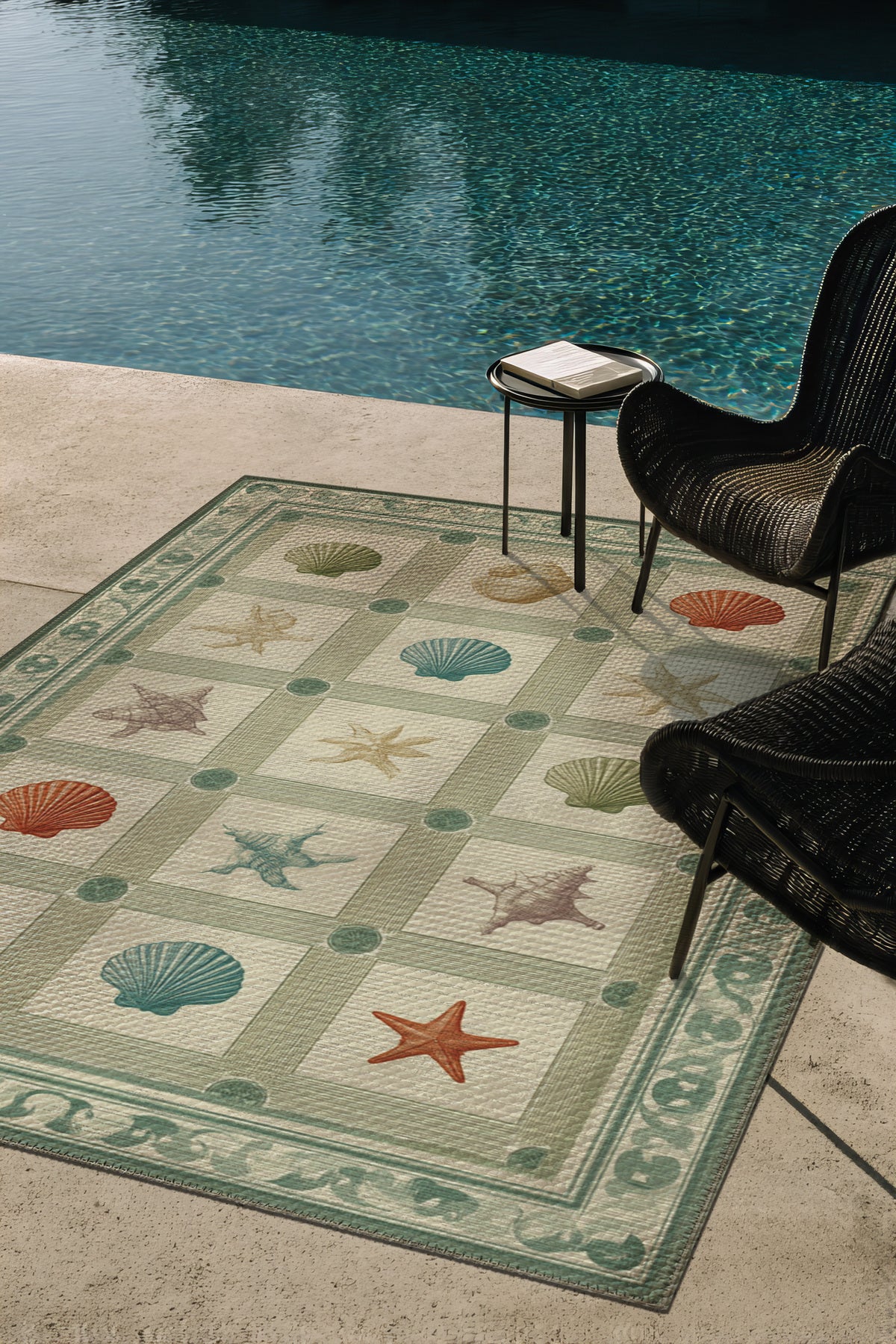Marine 91 Yeşil Kareli Deniz Ürünleri Tasarımı Yıkanabilir Modern Oturma Odası İnce Oda Salon Halısı