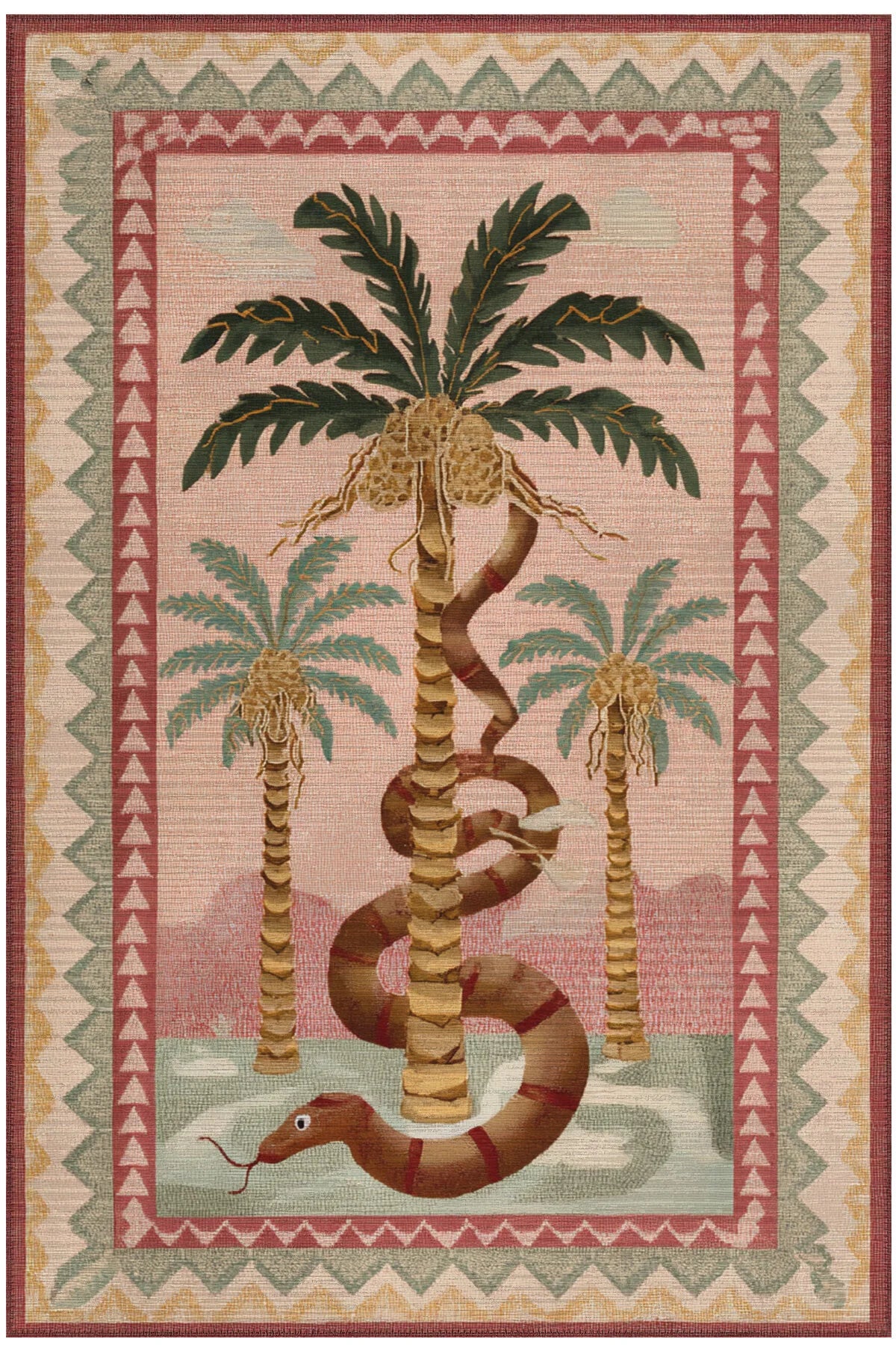 Canlı yeşil yaprak tonları, doğal kahverengiler ve sıcak mercan kırmızısı dokunuşlarıyla bu halı, modern evlerde egzotik bir atmosfer oluşturur.