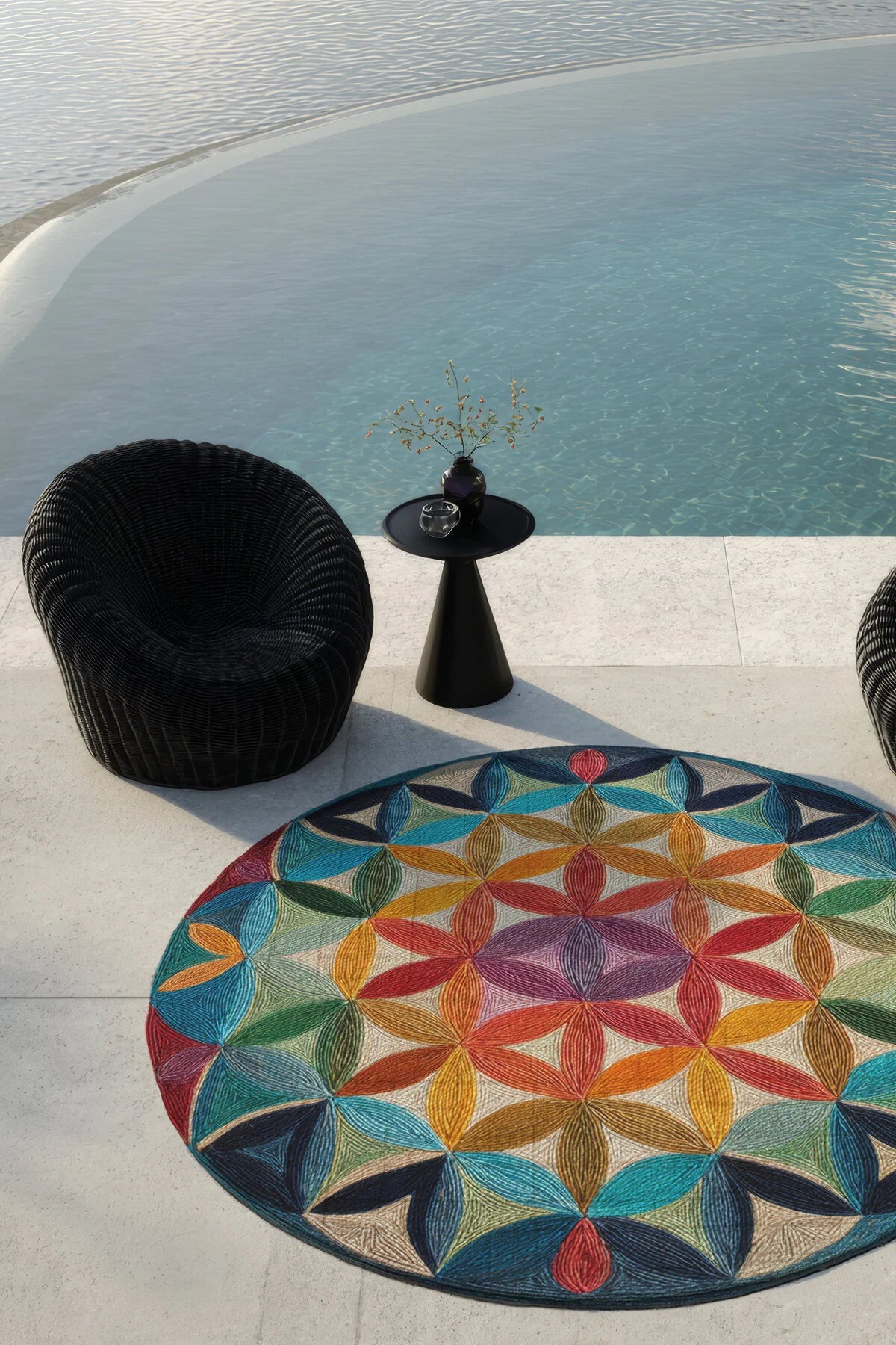 Porto 75, renkli geometrik ve soyut desenleriyle modern yaşam alanlarına sanatsal enerji katar. Yıkanabilir, ince dokulu ve yuvarlak formuyla balkon, antre ve mutfak dekorasyonlarında şık bir vurgu oluşturur.