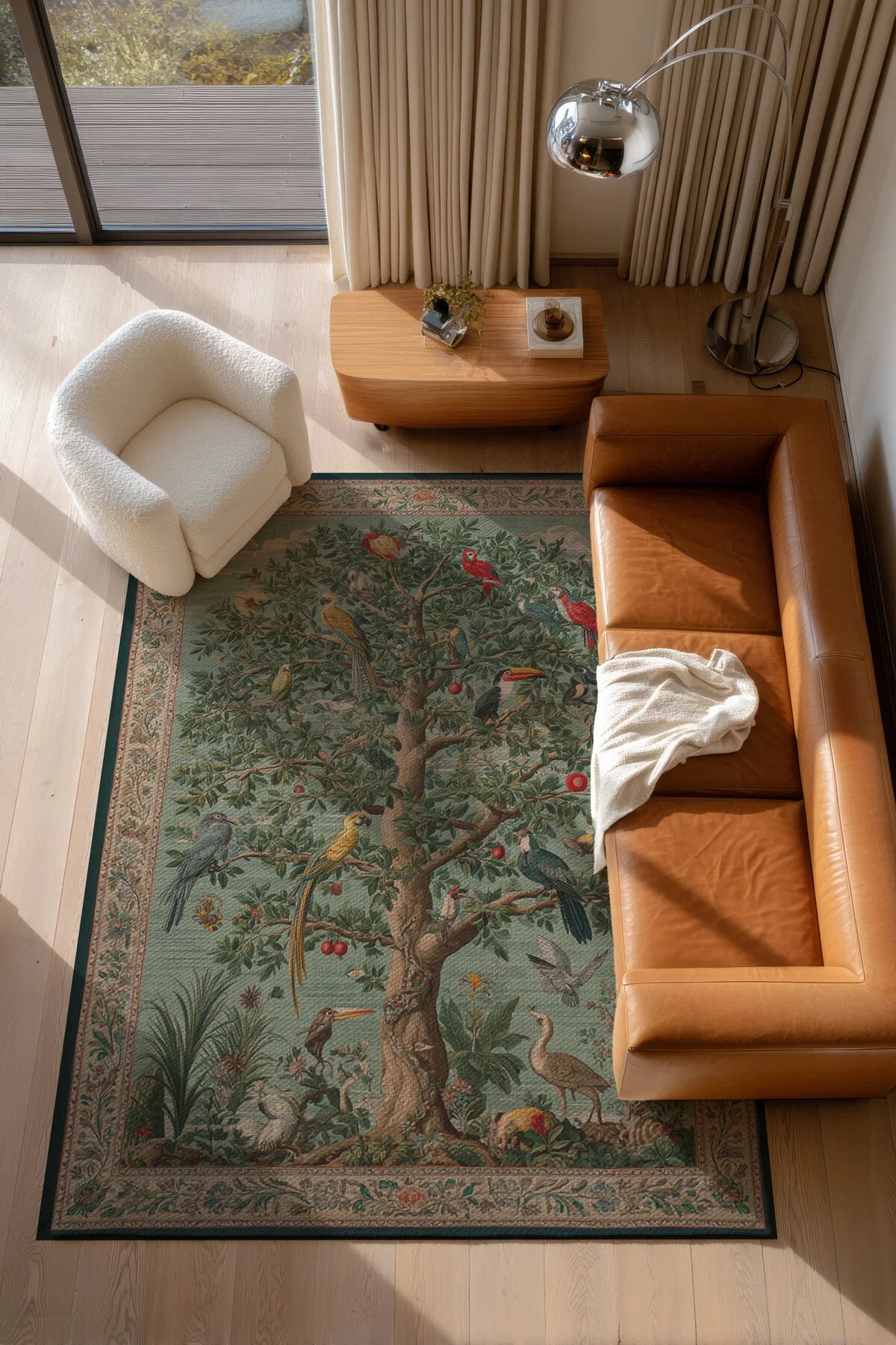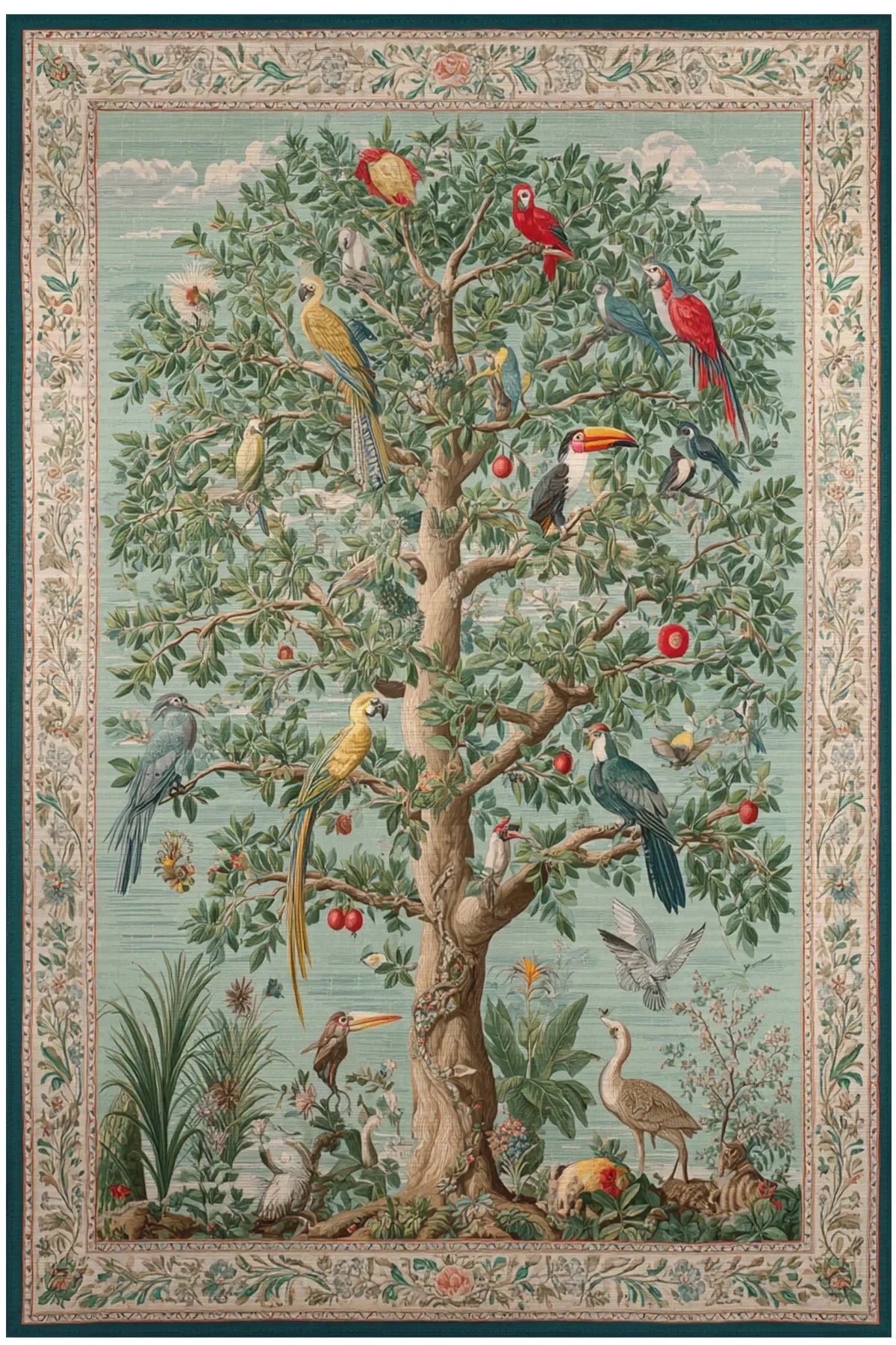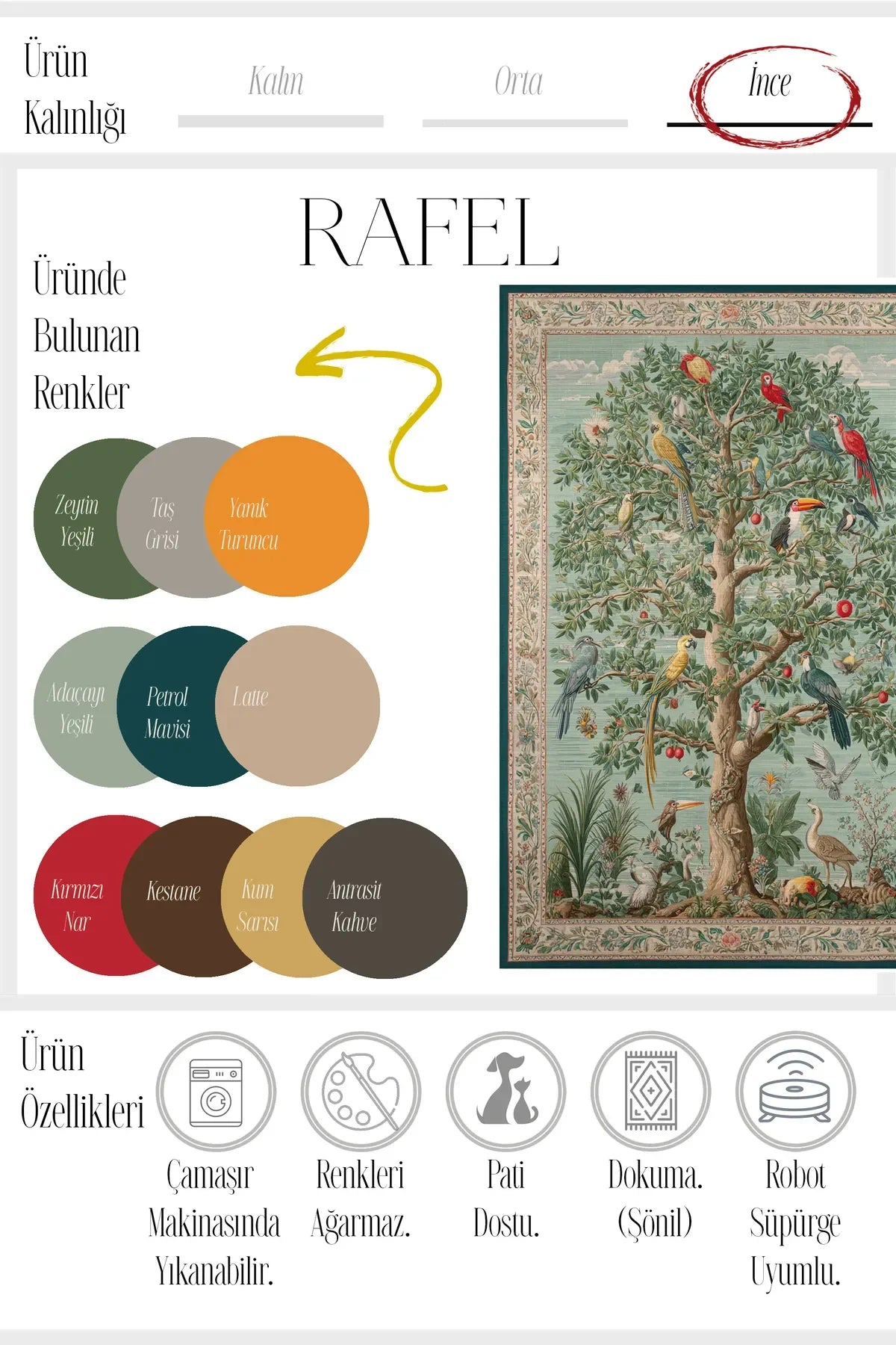 Egzotik kuşların ve yemyeşil doğanın iç içe geçtiği büyüleyici bir sahne sunan Rafel halı, doğadan aldığı ilhamla yaşam alanlarını sanatsal bir tabloya dönüştürür. Ortasında yer alan büyük ağaç, etrafını saran papağanlar, tukanlar ve zarif doğa detaylarıyla görsel bir şölen yaratır. Pastel zemin üzerinde yer alan detaylı çiçek bordürleri ise vintage zarafetle tropikal enerjiyi birleştirir.