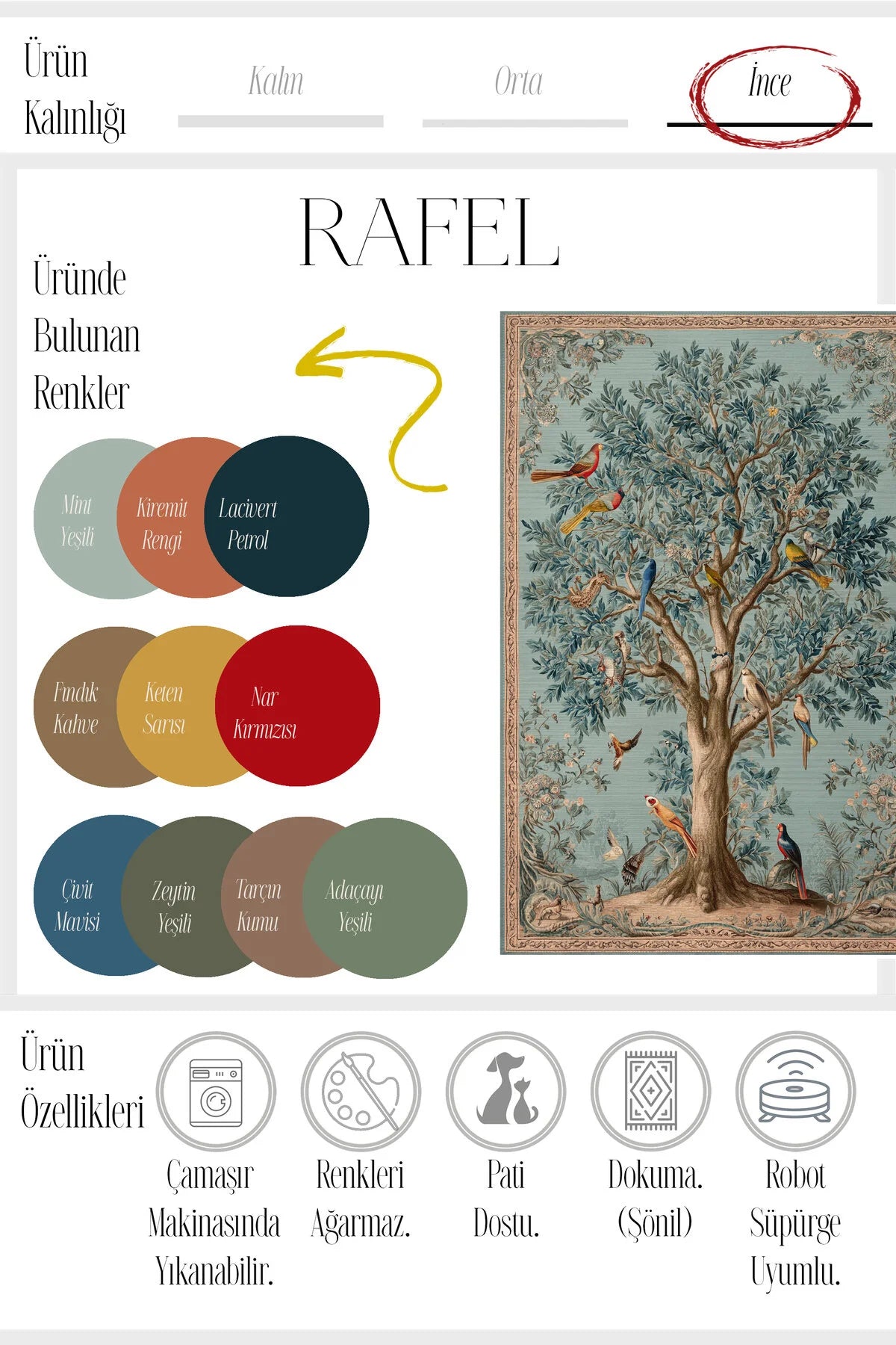 Doğanın büyüleyici renk paletini evinize taşıyan **Rafel Halı**, egzotik kuşların ve yemyeşil bitki dokularının iç içe geçtiği sanatsal bir manzara sunar.