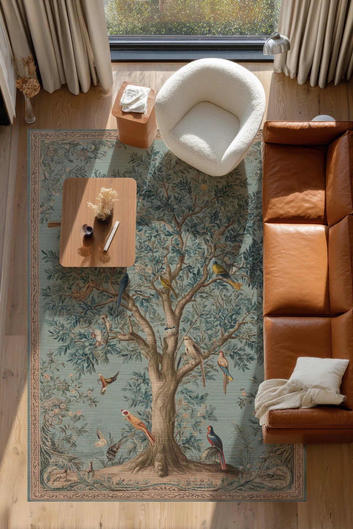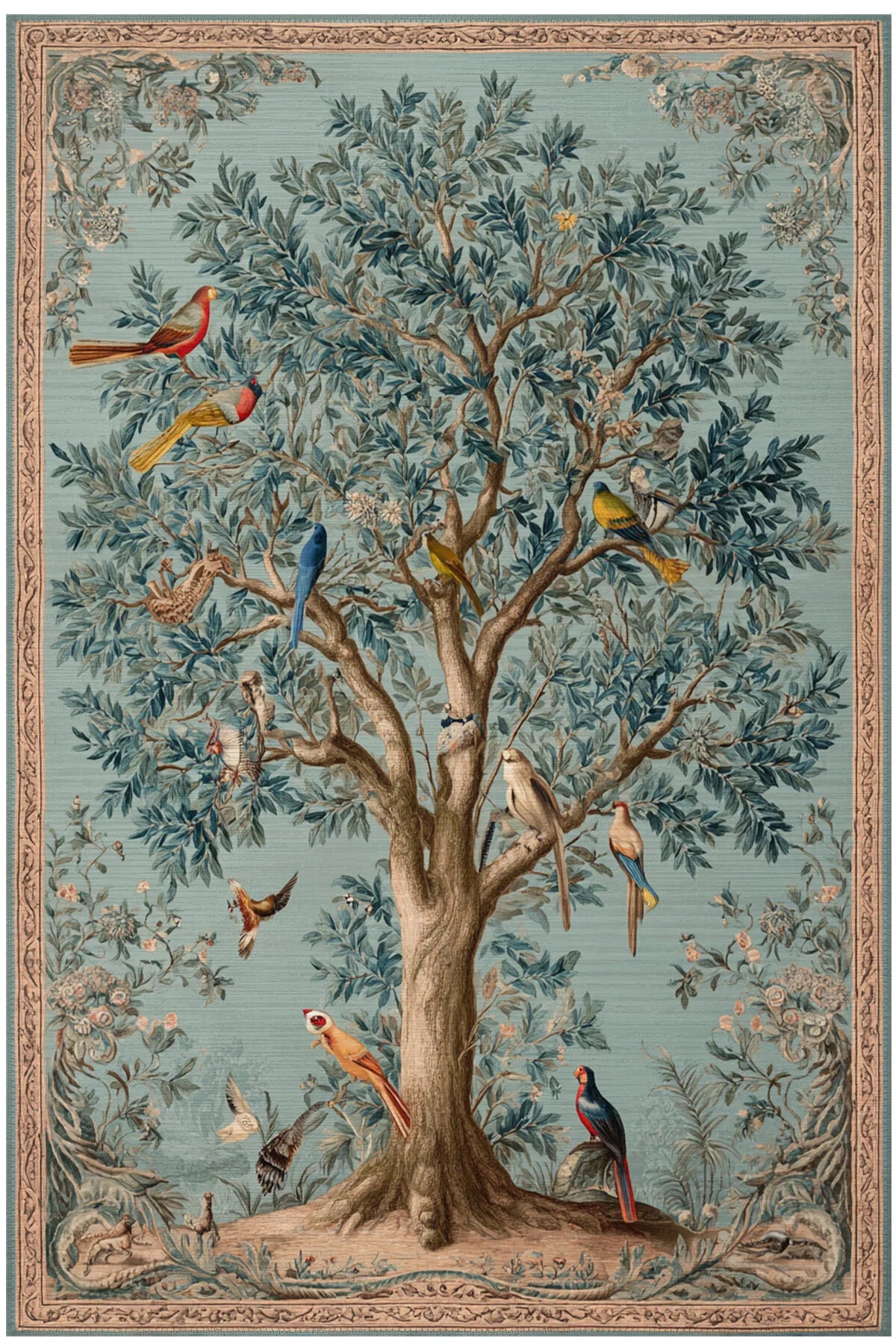 Ortadaki büyük ağacı çevreleyen rengârenk papağanlar, tukanlar ve çiçekli dallar; halıya tabloyu andıran göz alıcı bir karakter kazandırır.