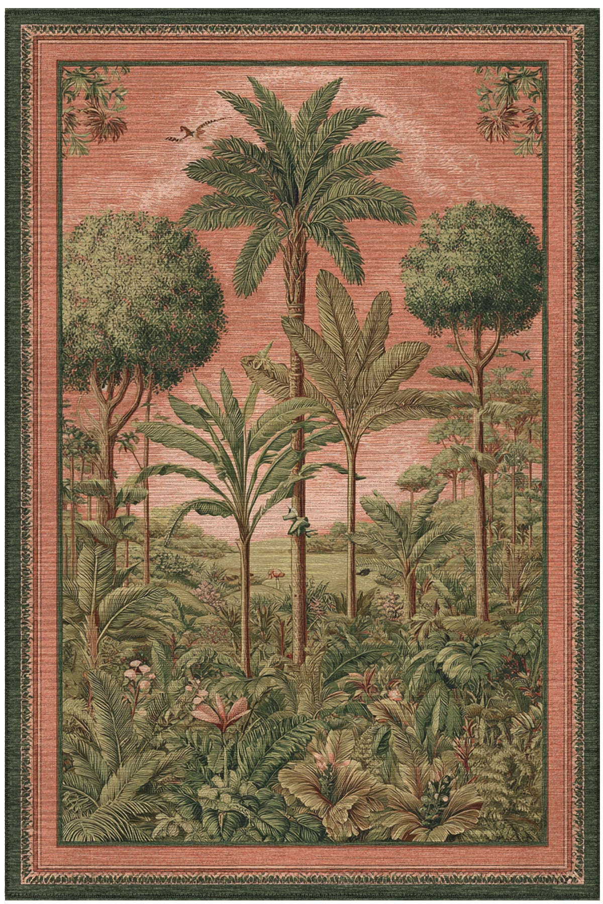 Doğanın büyüleyici güzelliğinden ilham alınarak tasarlanan Egzotik Doğa Temalı Halı, tropik yaprakların, palmiyelerin ve canlı mercan tonlarının uyumlu birleşiminden oluşur. Orman hissini yansıtan detaylı dijital baskı deseni, yaşam alanlarına ferah, sıcak ve doğal bir atmosfer kazandırır. Pastoral sahneleri zarif bir bordürle tamamlayan bu halı, iç mekânlara sanatsal bir enerji ve stil sahibi bir dokunuş getirir.