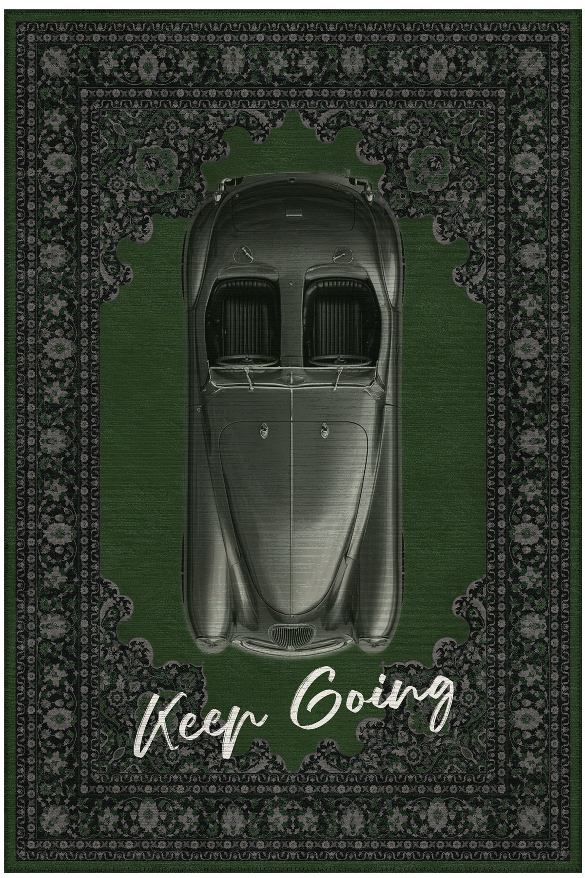 Orta bölümdeki vintage otomobil figürü, tasarıma karakteristik bir duruş kazandırırken “Keep Going” yazısı, halıya motive edici bir anlam katar.